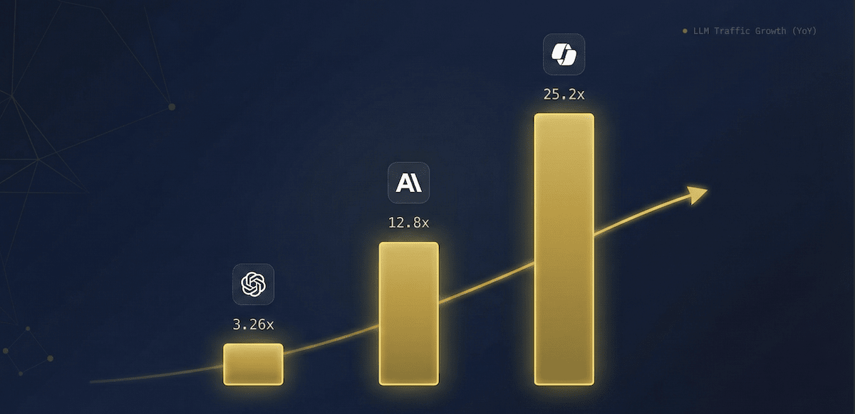- ChatGPT owns 84.2% of AI referrals, growing 3.26x year-over-year to establish itself as the default AI discovery interface